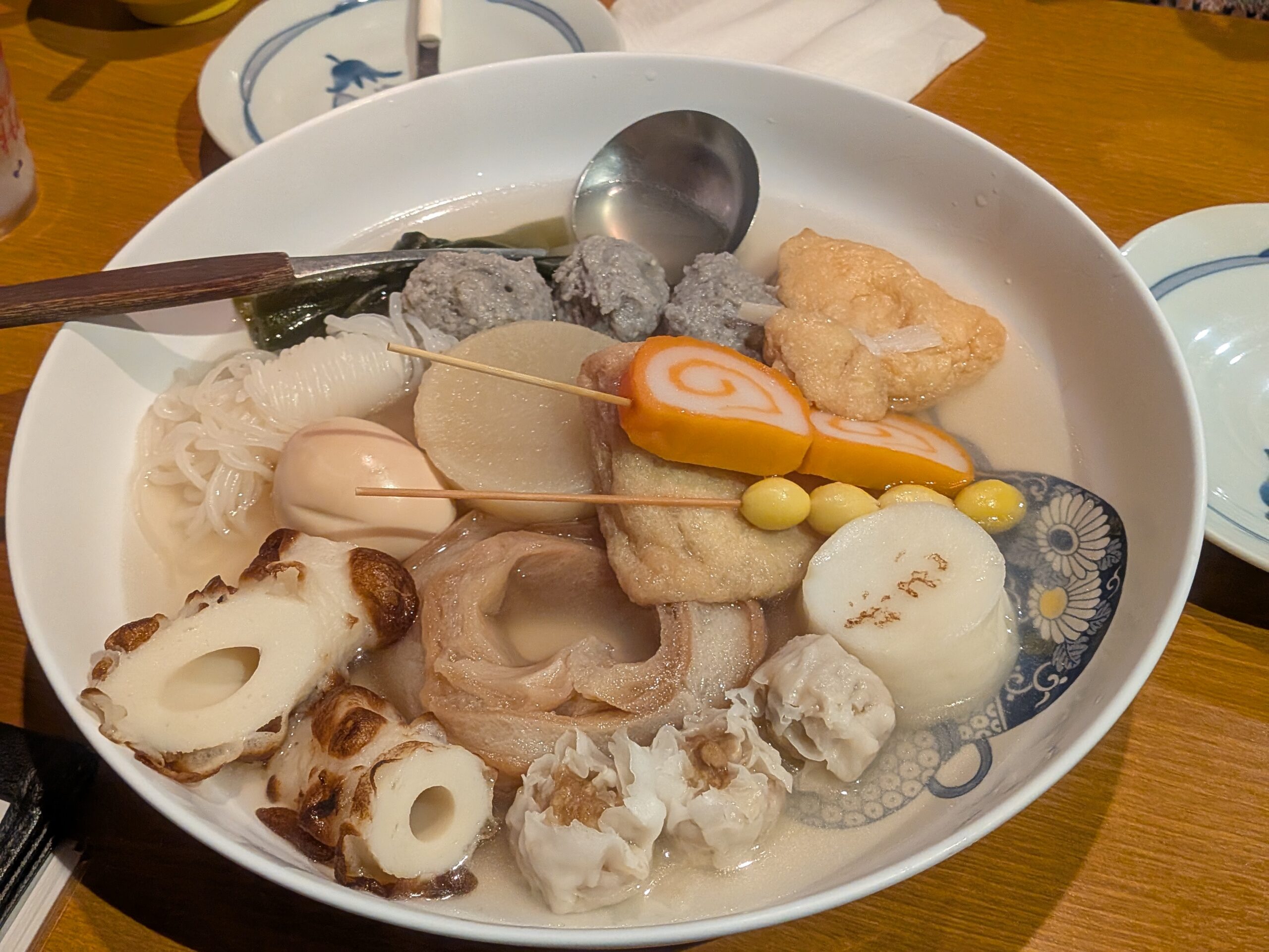店内は落ち着いた雰囲気で、カウンター席は半分ほど埋まっており、僕たちは子供連れだったのでテーブル席に案内されました。テーブル席だとおでん鍋が見えないので雰囲気は微妙かも。観光客もいますが、地元の人と思われるお客さんもちらほらいて、観光地の店としては落ち着いた印象でした。