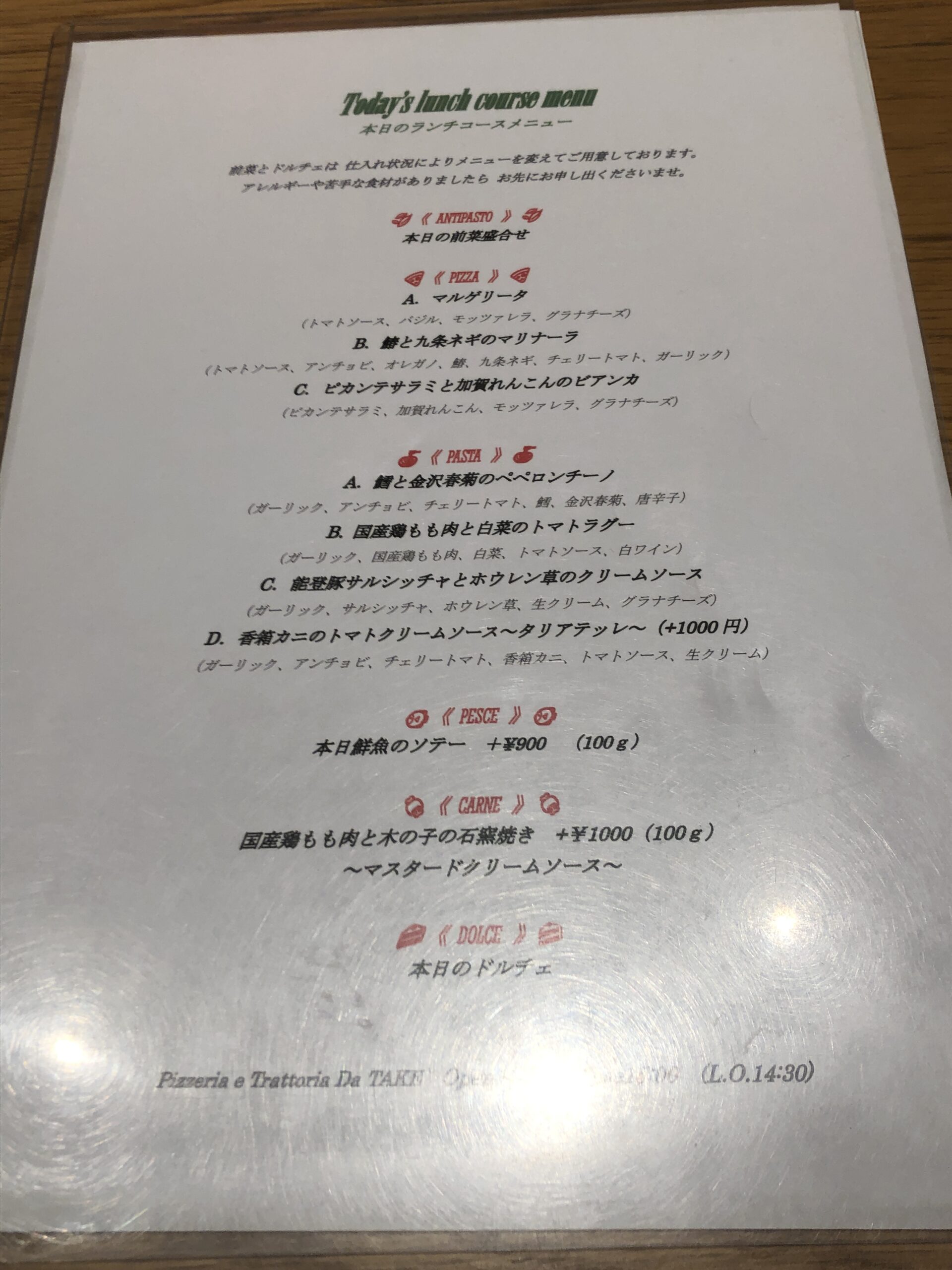 Today’s lunch course menu