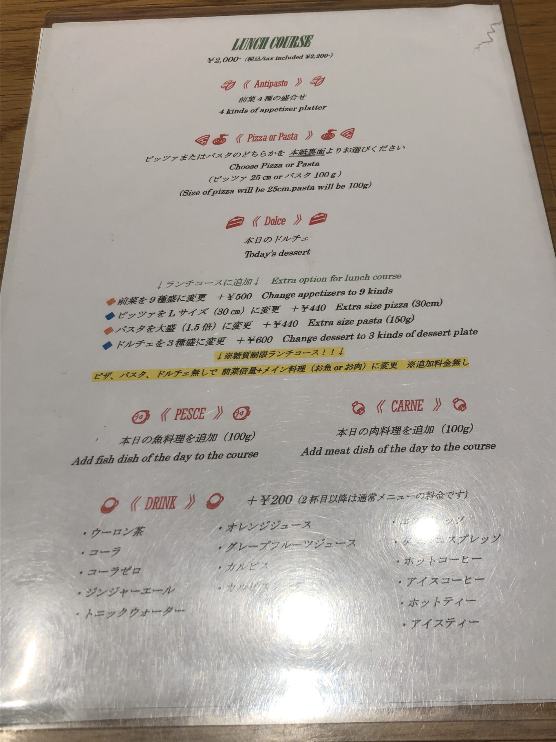 前菜を豪華にしたり、ピザ・パスタを大き目にしたり、ドルチェを豪華にしたりでオプション料金という設定。