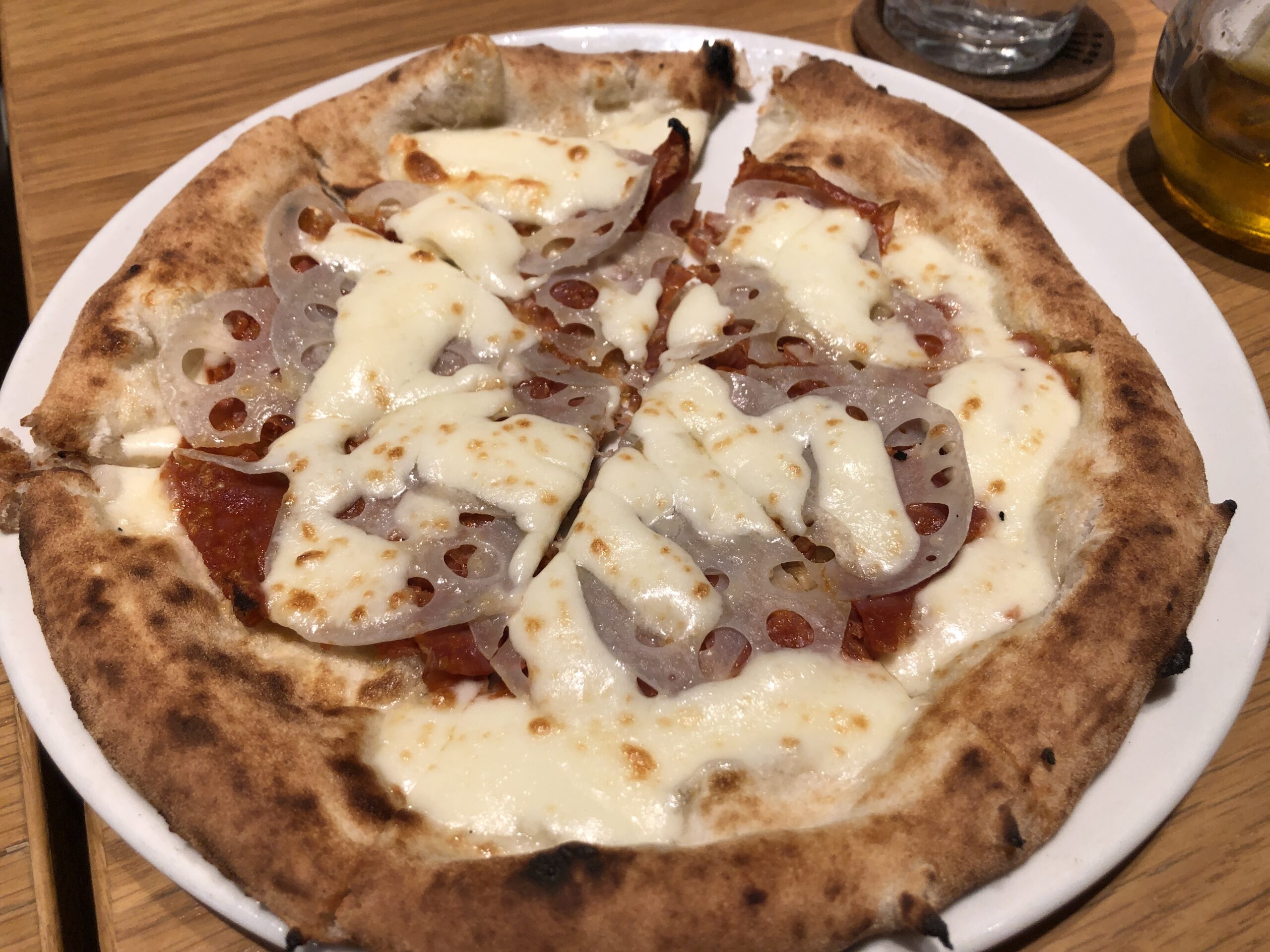 石川県といえばのレンコンのピザは珍しいかと思って注文してみました。食べてみると意外にもピザにマッチしていて美味しい。