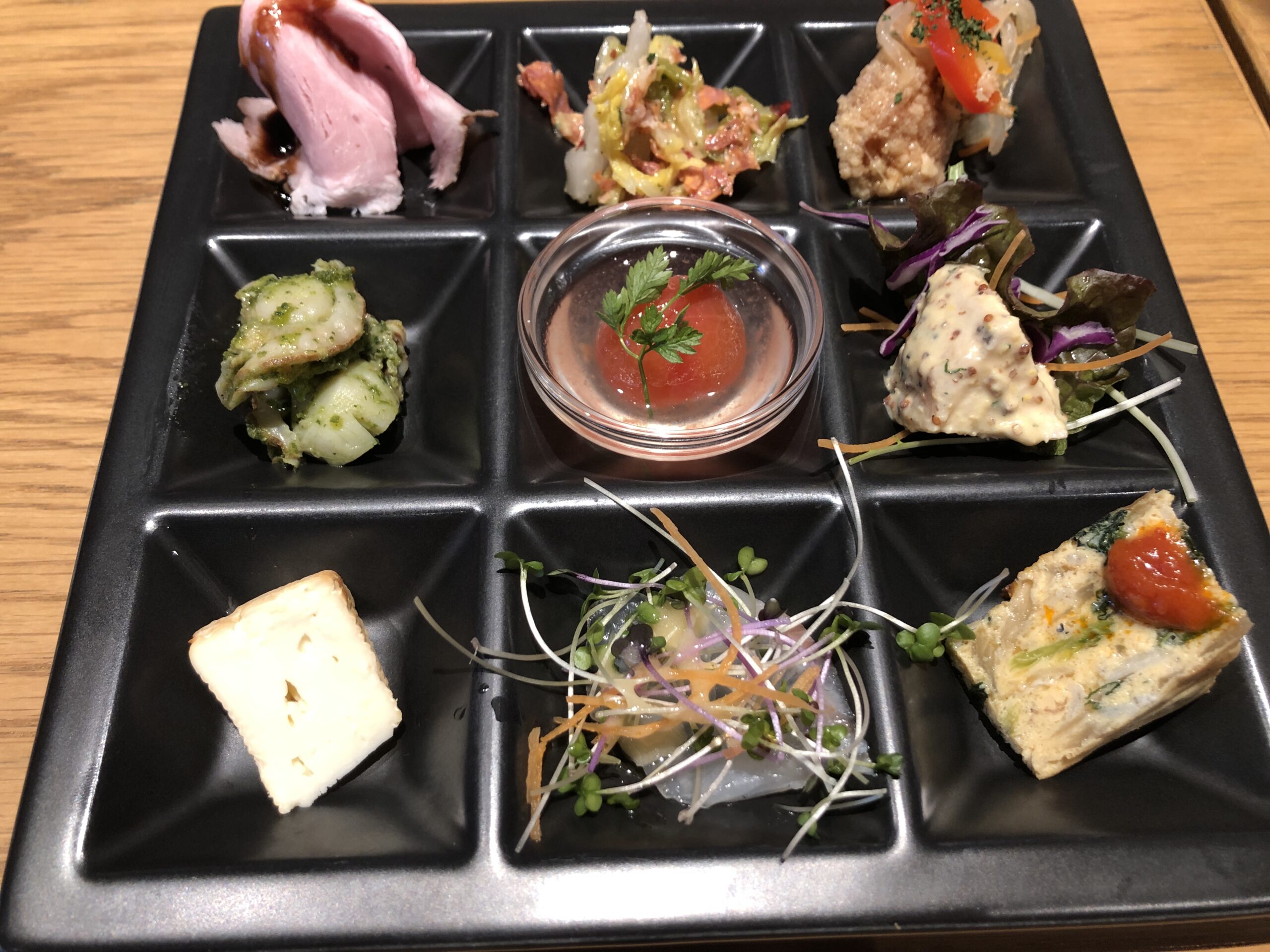まずは前菜。+500円で9種盛りに豪華にしています。